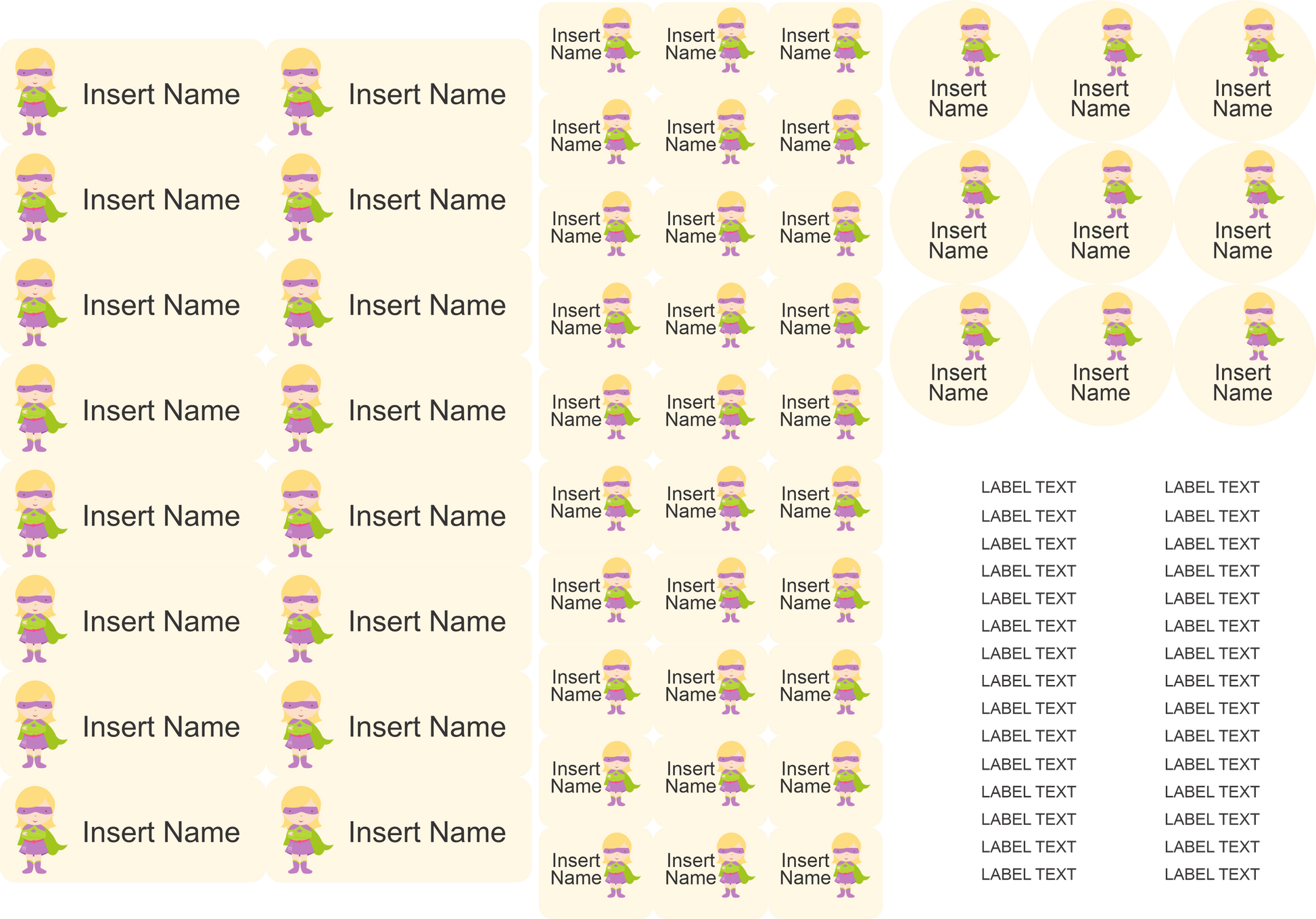 Mixed: 85 labels in total - 16 large, 30 mini, 9 round and 30 pencil labels